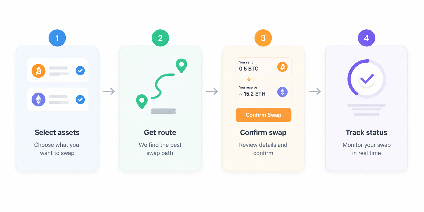 At a high level:1. You choose send and receive assets2. SWYPE returns route options3. You confirm a route4. SWYPE creates execution instructions5. You track progress to completion